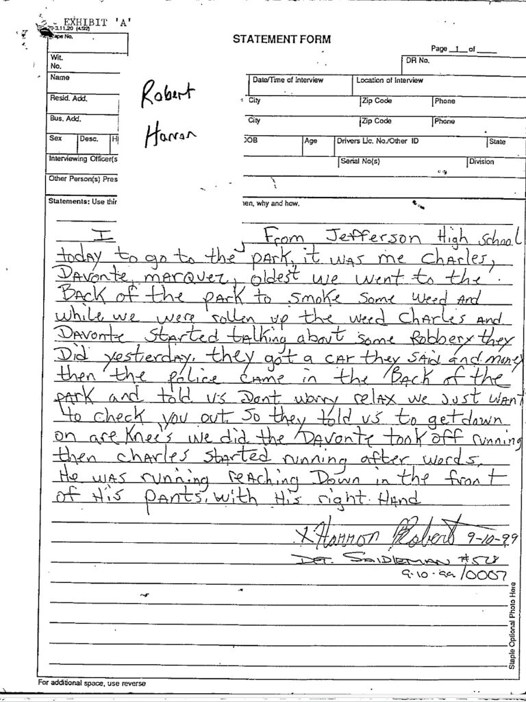 Robert Harron initially implicated me in this case. I don’t call it snitching because that would imply he was telling the truth. This was more of a smoke screen to take police attention off of himself. He ultimately was not even credible enough for the prosecutor to call as a witness but peep the real life affidavit.